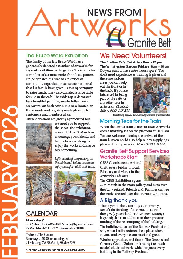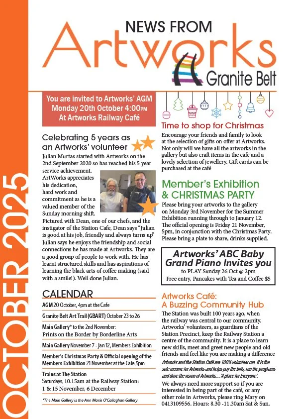 Friends and members past and present are invited to join us at 3pm on Sunday October 13 in the Heritage Railway Station to meet the new committee and celebrate another successful year at Artworks.